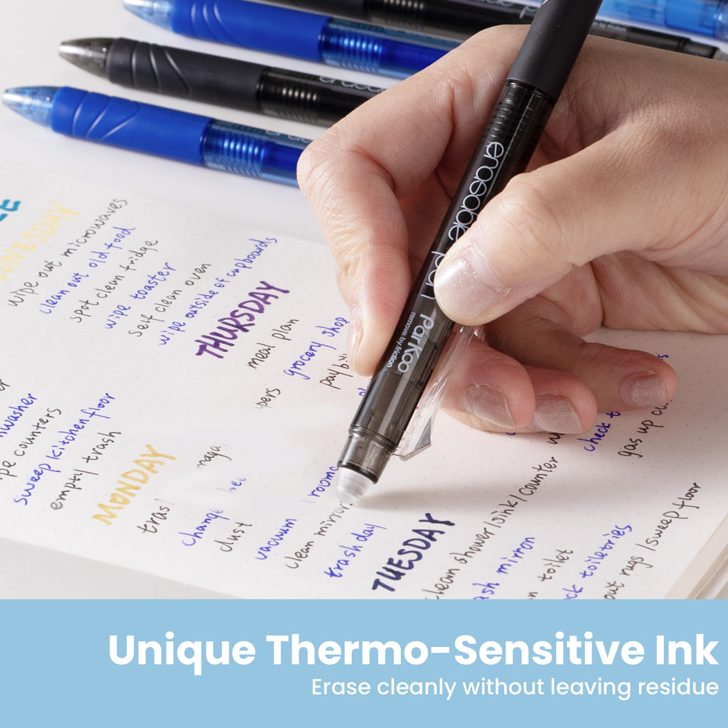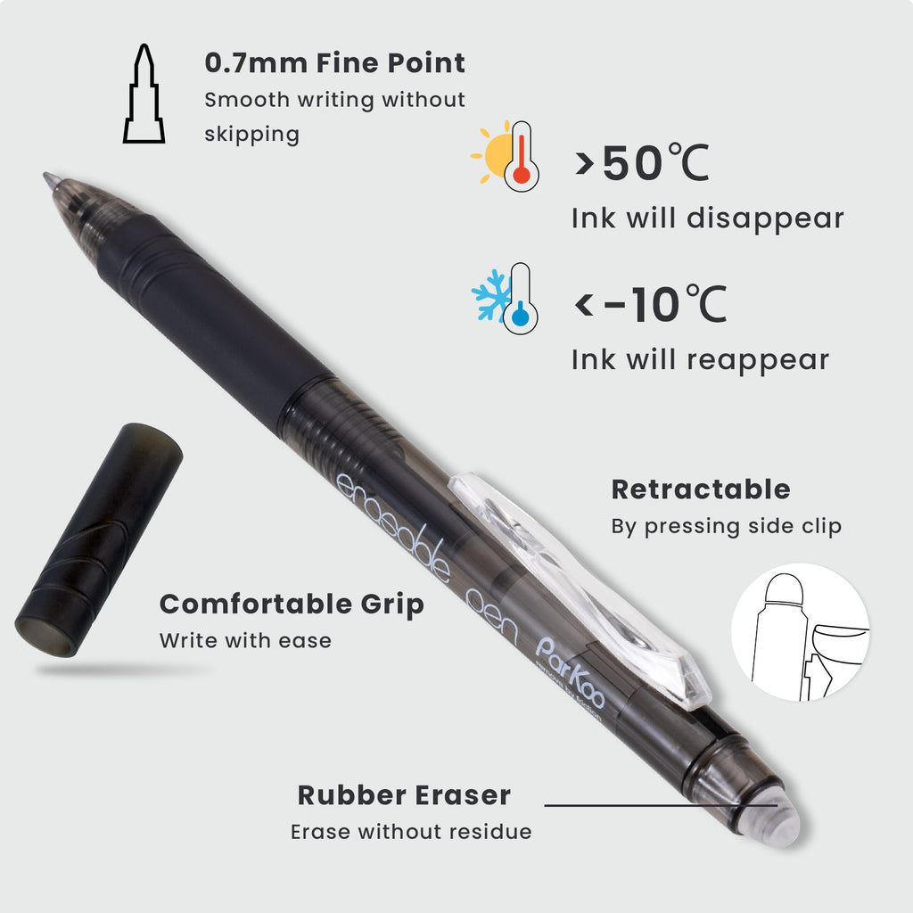 - Pens with Erasers: ParKoo erasable pens let you enjoy smooth writing while leave no room for error; Write, erase and rewrite without damaging documents; These black erasable pens works great for note taking